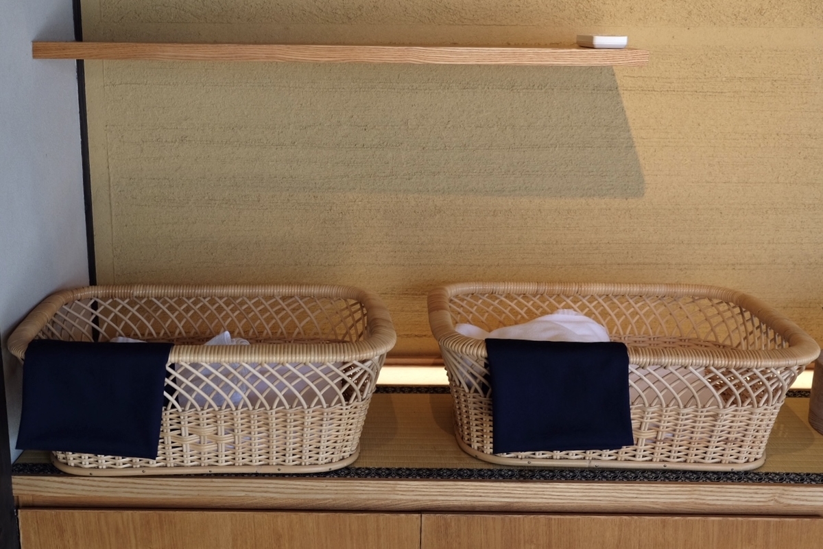 脱衣籠にはタオル、バスタオル、風呂敷が入っていました。