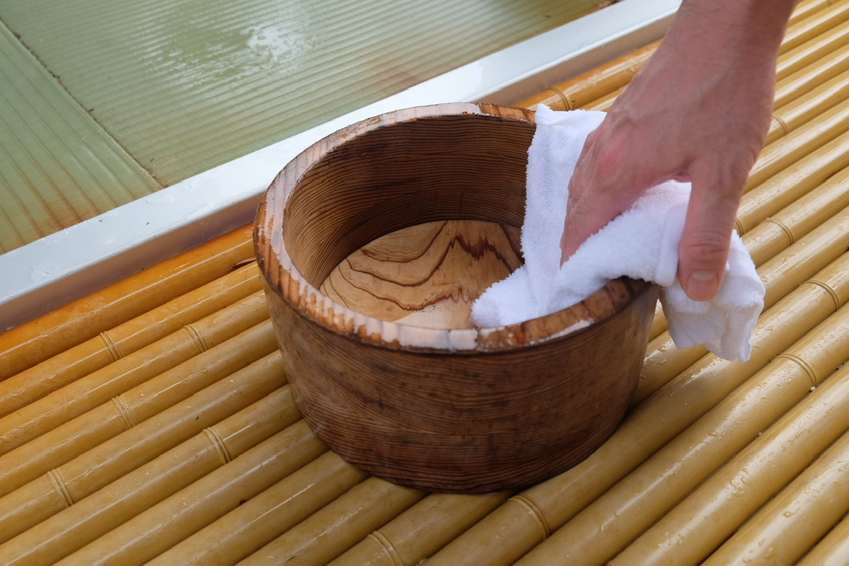 最後の垢離(こり)を行った後、水に浸した手ぬぐいを固く絞り、全身を拭きます。